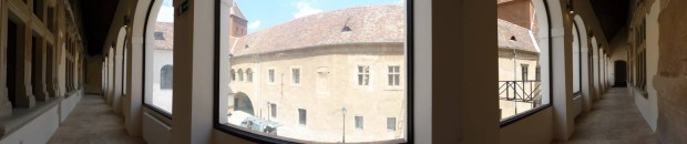 A kép a reneszánsz folyosón készült az első emeleten, a lovagterem főbejárata előtt. Betekintést nyerhetünk a vár udvarára, és jól látszik a turisták által is látogatható északi torony.