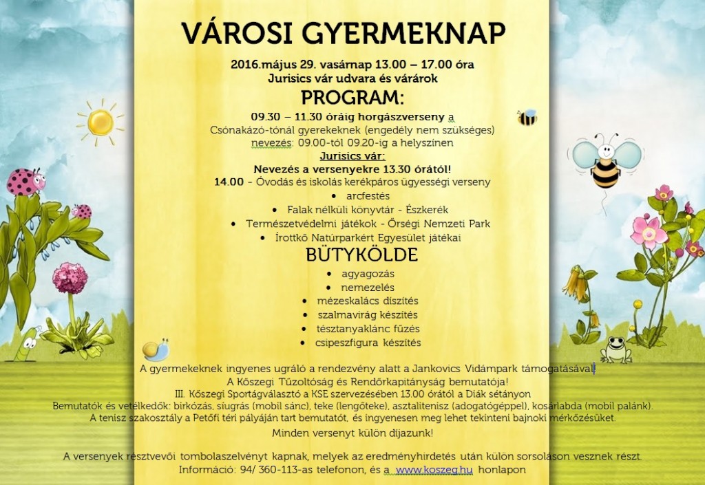 Városi GyereknapIII. Kőszegi Sportágválasztó2016.május 29. vasárnap 13.00 – 17.00 óra - Jurisics vár udvara és várárok. PROGRAM: 09.30 – 11.30 óráig horgászverseny a |